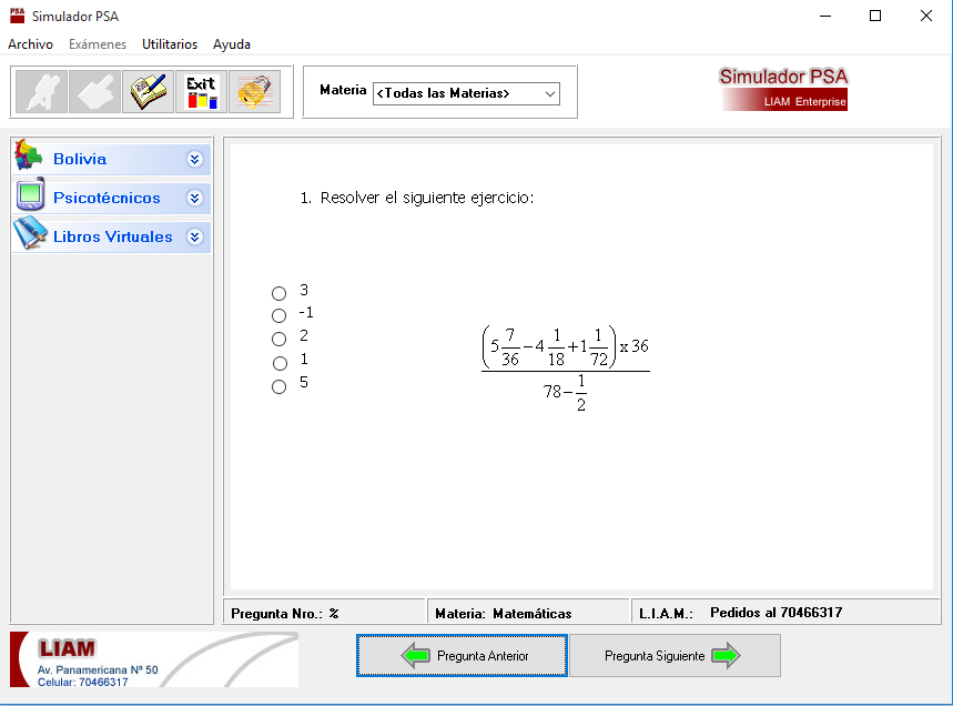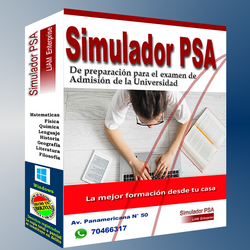 SIMULADOR PSA es un software de aplicación dirigido a la preparación, evaluación y práctica de los exámenes de suficiencia académica de las Universidad Bolivianas. Puede ser usado por Escuelas, Colegios públicos y privados, institución educativas y estudiantes en general que tengan directa o indirectamente necesidad de práctica en las diferentes materias a ser evaluadas en su Examen de Admisión.
